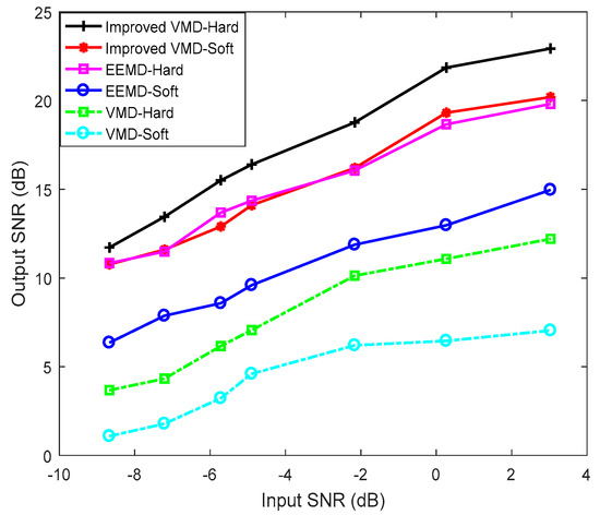 The variation of the output signal-to-noise ratio (SNR) by EEMD, VMD and the improved VMD methods with soft and hard thresholds for interval thresholding. The improved VMD method outperforms other methods.
