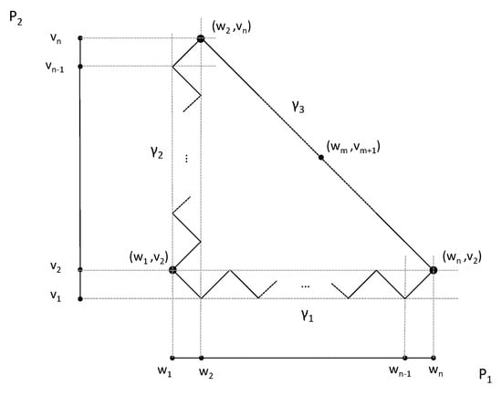 Since and are unbounded graphs, for each positive integer n there exist two geodesic paths in and in . If n is odd, then we can consider the geodesic triangle T in (see Figure 1) defined by the following geodesics: