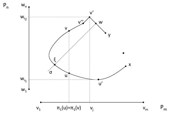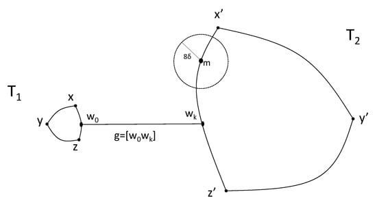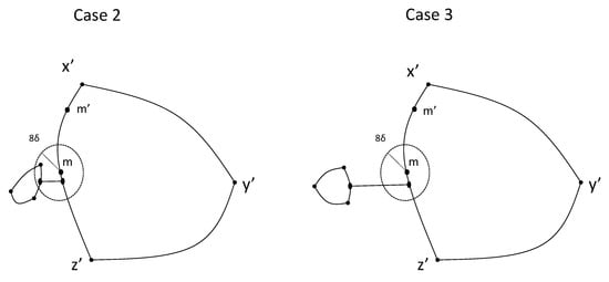 Finally, assume that . Let us consider such that . Thus, . To finish the proof, it suffices to prove that . Seeking for a contradiction, assume that . By Theorems 6 and 7, there is a geodesic triangle and with . Then, . Let (respectively, ) be the closest vertex to x (respectively, y) in , and consider a vertex in such that . Note that implies that . Since , we have and, consequently, is a geodesic in . Since is a path in joining and , there exists a vertex such that and . Therefore, and, consequently, , leading to contradiction. □