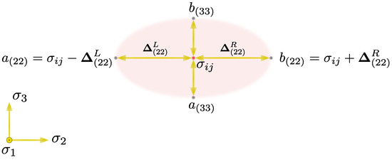 The interpretation of the virtual surrounding in a stress state depends on the specific material (see [28]), but in general it could be understood as a (homogenized) phenomenological measure of some instability, e.g., for metallic materials it is connected with dislocation nucleation [32,33,34], nucleation of voids [35] or breakup of grains [36,37,38] (see review paper [39]). By way of illustration, Figure 1 shows the cross-section of this virtual neighbourhood in the plane.