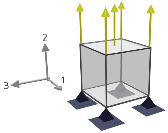 The conducted parametric study is focused on the material point level represented by a unit cube with dimensions of 1 × 1 × 1 mm discretized by a single finite element C38DR (linear, eight-node brick with reduce integration). The boundary conditions required to achieve uniaxial constraints are shown in Figure 3. Basic mechanical properties were assumed as for the carbon steel, therefore the elastic range was characterized by Young’s modulus E = 205 GPa and Poisson’s ratio = 0.27. The fractional flow rule presented in Section 2 was applied in the plastic range. The static yield stress in simple shear for the selected material was = 605 MPa. Other material parameters, depending on the studied case, were chosen as described below.