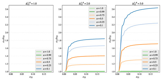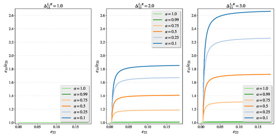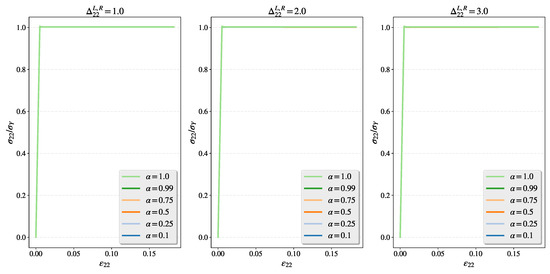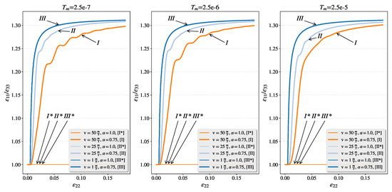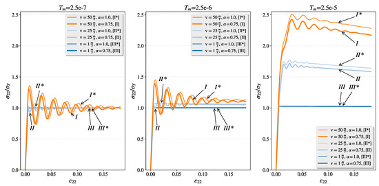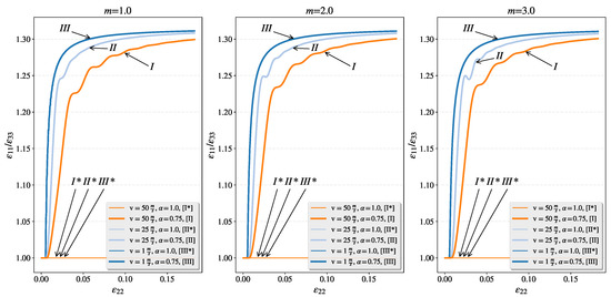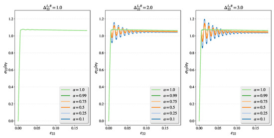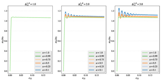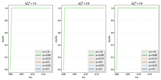 Results presented in this section were obtained for a parameter set similar to this in Section 4.2.1 with the difference that flow intensity is increased in the direction perpendicular to tension, namely . Others components of vectors in Equations (24) and (25) equal 1. As in the discussion in the previous section, the tension velocity of is insufficient to reveal the influence of on the stress–strain relation (see Figure 6). However, Figure 7 shows that the material prefers to deform in (1) direction when the magnitude of growths, hence the ratio is greater then 1. Moreover, the intensity of the flow in the preferred direction increases as the value of diminishes to 0. Next, as before, the velocity is increased to . Figure 8 shows that when the value of rises, greater amplitude of the oscillation and hardening of the material can be observed. This last effect is inversely proportional to the order of the fractional flow. The relation between and is presented in Figure 9 and is very similar to Figure 7 with the only distinction that slight oscillation occurs as a result of higher velocity. So, we conclude that both fractional parameters control the anisotropic properties of a fractional model in the plastic range.