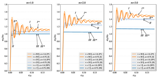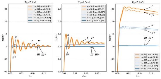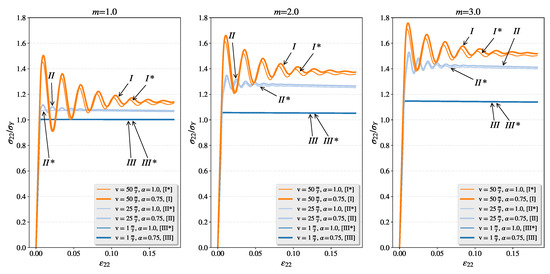 Two kinds of plots were used to present the results of the parametric study. The first kind exemplify the relation between three normal strains . The second type shows the stress–strain relation in the tension (2) direction (it should be pointed out that for this kind of plots, a ‘softening’ is observed, especially for highest tension velocities, however, this effect is due to the lateral stresses induced by the inertia effects and is not due to constitutive model See Figure 4, where this effect is negligible due to relatively small tension velocity ). The research on influence of the fractional derivative order was performed for a set —as mentioned earlier, fractional generalization of the viscoplasticity reduces to the classical solution for . The study of and m was conducted for three different velocities of tension, i.e., , 25 and .