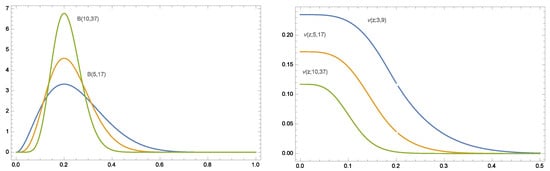 where , and is the beta function. Given that its CDF verifies that and the sign of its skewness depends only on the condition or , we can study only the case .