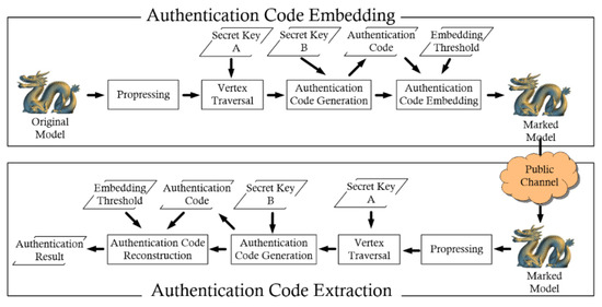 Whereas fragile watermarking has been extensively studied in images [9,10,11,12,13,14], videos [15,16], and audio [17,18], there are still few studies discussing its application in 3D models. According to the size of the tampered region localization, 3D fragile watermarking algorithms can be classified as either vertex-based or region-based ones. A vertex-based algorithm can exactly locate a modified vertex, whereas a region-based one can only locate a rough region with some unaltered vertices inside. However, a region-based fragile watermarking algorithm has the ability to detect the modification of the topological relationship between vertices.