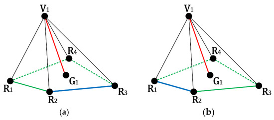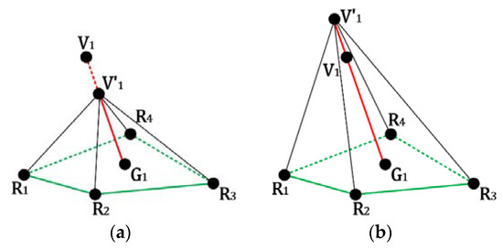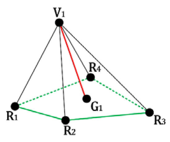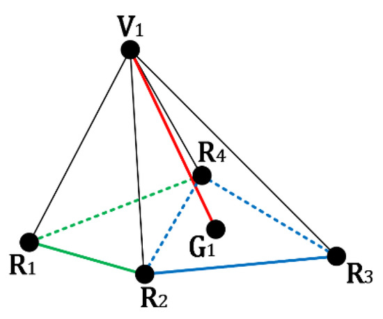 However, not each vertex pair in the original input model has one edge to connect them. For the example shown in Figure 2, assume that , , and are the selected reference vertices for the embeddable vertex . Comparing Figure 2 with Figure 5, no edges are presented to connect the vertices and . To make the following processes correctly performed, we construct the ‘virtual’ edge to connect the corresponding two unconnected vertices. becomes the center of the used reference vertices , , and . Further, the minimum number of used reference vertices is set as 3.
