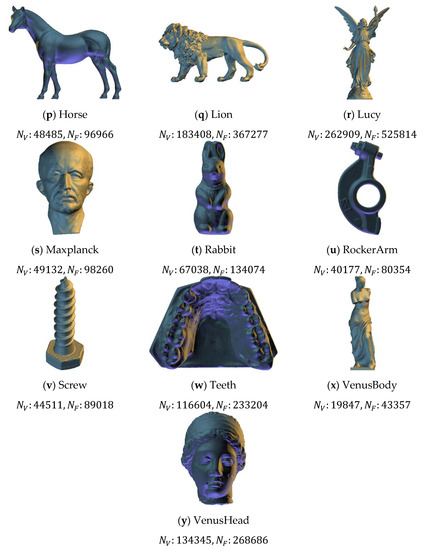 This section presents the experimental results obtained from twenty-five 3D polygonal models shown in Figure 6, where and mean the number of vertices and faces separately. Microsoft Visual C++ programming language was used to implement the proposed algorithm on a personal computer with an Intel Core i7-6700K 4.00 GHz processor and 16 GB RAM. The distortion between the original and marked models was measured by normalized root-mean-squared error, which is derived from dividing the root-mean-squared error by the model size.