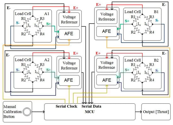 The thrust data logger was designed to continuously measure the thrust value generated by the quadcopter’s rotors and was used in the pre-flight calibration process. There are three components required to design this system, that is, a load cell sensor, an analog-front-end (AFE), and a microcontroller unit (MCU). A detailed schematic of this thrust data logger can be seen in Figure 1. The load cell sensor is usually used as a tool to measure weight and force [,]. In this study, it was used to measure thrust based on the correlation between weight and the magnitude of the gravity acceleration. The output of the sensor is a voltage signal, which needs to be translated into a digital form using an AFE containing a 24-bit analog digital converter (ADC) driver before being processed by the MCU. The MCU calculates the analog input voltage between 0 to 5 volts, which yields a resolution between a reading of 4.9 mV per unit. With a 16 MHz MCU clock, the ADC must be set to a 125 kHz sampling rate. The thrust calibration was performed on the MCU, and this system was designed to retrieve data once a second. The thrust data logger was calibrated using professional equipment. An automatic zero calibration was designed so that the weight of the quadcopter is eliminated; thus, only the thrust value on each axis has been obtained. The manual calibration using buttons was provided to ensure the initial values before starting the data retrieval process.