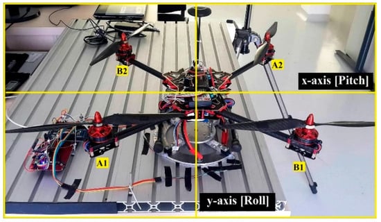 One of the thrust data logger system applications in a quadcopter is to set the coefficient values of the PID control system. This control system allows for minimizing errors during manoeuvers, by performing a manual adjustment to the coefficient of the PID in correlation with the quadcopter’s angle and position on each axis. Details of the PID algorithm and simulation analysis are presented in previous research []. A translation or rotational error can occur with different magnitudes on the pitch, roll, and yaw motion. Based on this condition, the PID control system is divided into three sub-systems, namely pitch, roll, and yaw. By adjusting the coefficient value of each motion using the Ziegler–Nichols rules, movement stability can be achieved [,]. After the data is processed, the thrust generated at the two-axis coordinates system (illustrated on Figure 3) will affect the angular change on the pitch (x-axis) and roll (y-axis).