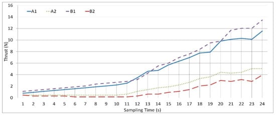 A thrust data logger with a maximum load of 4 kg was tested to measure the thrust value and perform a stability adjustment for a 1.8 kg quadcopter. A laser optical sensor was used to measure the angular velocity of the rotor–propeller. At the time of the measurement, all of the electronic and mechanical parts of the quadcopter should be in the same position under conditions similar to flight. The quadcopter’s center of the mass must be aligned with the thrust data logger’s center, otherwise the total reaction of the torque on the airframe quadcopter may be affected. The first test was performed to determine the thrust value generated in throttle mode, with the rotor speed increasing gradually from 1200 rpm to 4080 rpm. As much as 24 sample points have been considered, each sample being acquired during a period of 1 s. The trust obtained from the data logger can be seen in Figure 4.