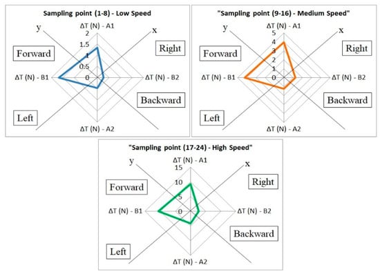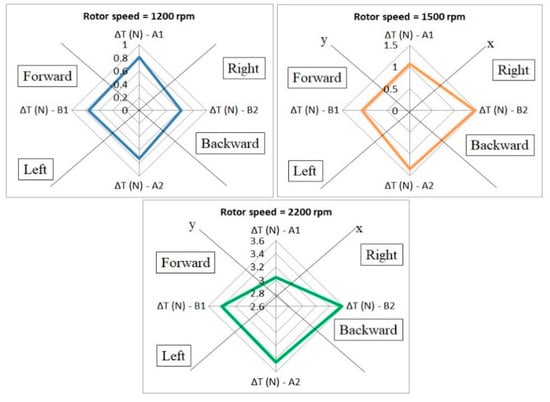 To analyze this data, it should be considered that the thrust produced by the propellers moving in the same direction (in A-axis or B-axis) will interfere with each other. Each rotor produces a different thrust with a significant error. In the A-axis, at 1200 rpm, the difference in the thrust value is 0.3 N while in the B-axis it is 0.5 N. With high speed, the thrust difference is approximately 5 N. The higher the speed, the greater the error, so stability cannot be obtained. If one rotor has a higher thrust than the other in the z-axis, then the position of said rotor will have a greater positive value than the other. Figure 5 shows the position and direction of the quadcopter for various thrust values. The acquired data has been split into three equal parts, for each of them the thrust value being the average of the acquired data, to find out the position error. The results show that the quadcopter has a tendency to move backward at any speed, and the field tests also yield the same result. In the hovering state, the quadcopter cannot maintain its position because of the imbalanced thrust.