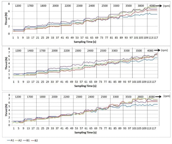 To overcome this problem, one can perform a trim calibration process and PID coefficient adjustment. Trim calibration is the adjustment of the zero value on both the remote control and the quadcopter, used only for manually controlled quadcopters. The trim positioning adjustment is done manually by doing a zero-positioning trim for the forward–backward channel. The thrust data calibration results were obtained using a data logger system for three speed values (i.e., 1200 rpm, 1500 rpm, and 2200 rpm). For each speed level, 50 thrust data acquired during 50 s sampling times are obtained. The corresponding data is then averaged to analyze the quadcopter’s position during hovering at the considered speed level, as shown in Figure 6. The trim control adjustment only helps to set the zero point. The thrust difference is smaller than 0.5 N for the considered speed values and the thrust data obtained during the 50 s sampling time is quite stable.
