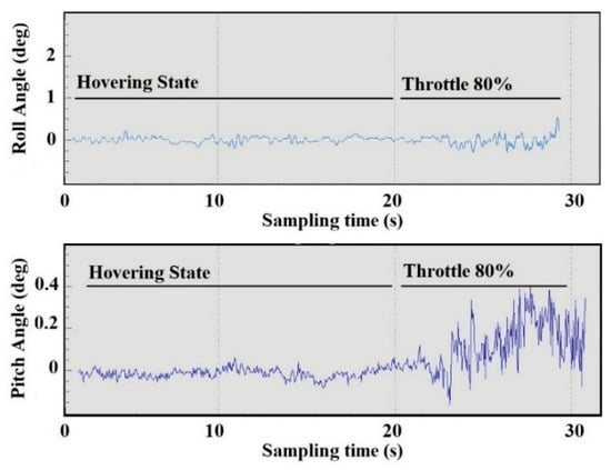Details of the position changes occurring during the hover state and throttle state can be seen by comparing the desired position with the actual one. The result showed a linear variation of the output, with the data indicated by a data logger, where the throttle with a high-speed level resulted in instability in the roll position. While hovering, the pitch position showed more stable data compared to the roll position. An angular change for both of the angles during hovering were less than 0.2° and both angles were oscillating at an angle of 0.5° at higher speeds. The orientation sensor with PID control in no-wind conditions seeks to stabilize the position of the quadcopter in a zero level, where high velocity oscillations may cause a vibration on the quadcopter’s frame. This proves that there is a linear correlation between the orientation sensor data and thrust data logger.