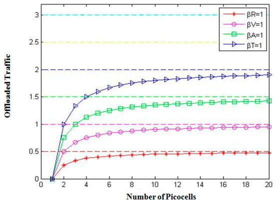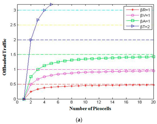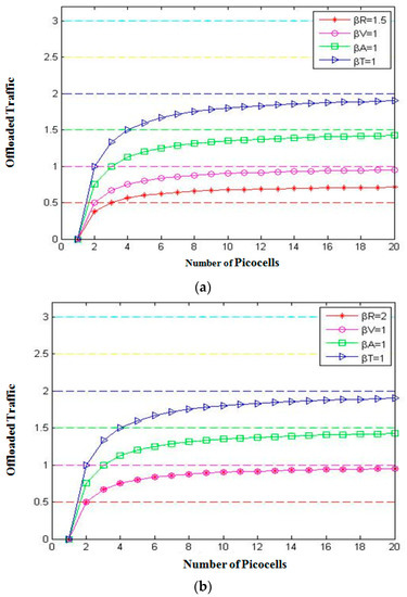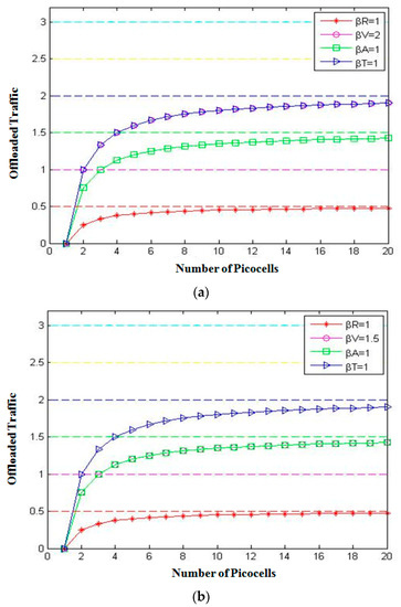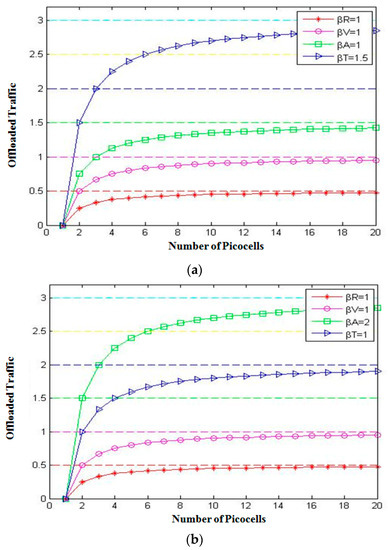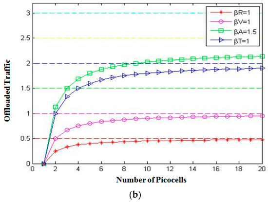 Offloaded traffic with (a) βD = 4, βR = 1.5, βV = 1, βT = 1, βA = 1 and (b) βD = 5, βR = 2, βT = 1, βA = 1, and βV = 1.