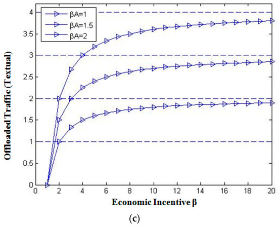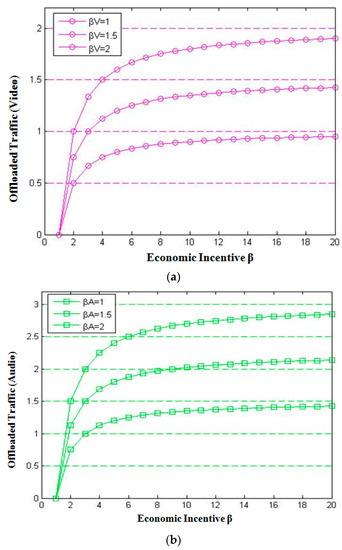 In Figure 4, the economic incentives were kept for all types of data equal to 1 except in (a) βV = 1.5, and in (b) βV = 2. It was observed that the video data got a higher rate of the download, and it matched with audio data at incentive βA = 1 when we further increased the incentive for video data to 2.