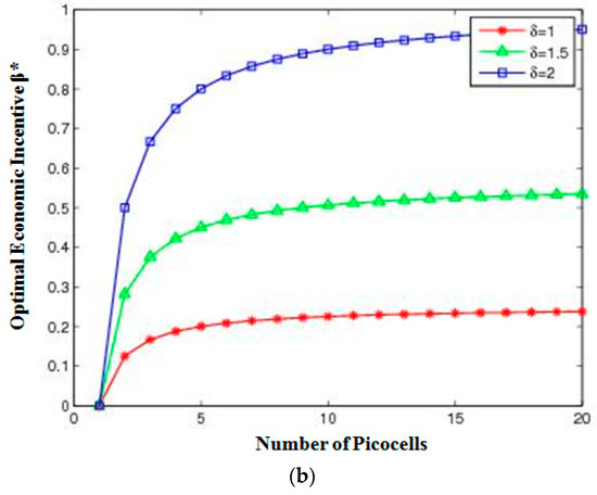 MBS’s linear utility and linear cost: (a) Macrocell utility βVs economic incentive, and (b) optimal economic incentive βVs number of APs.