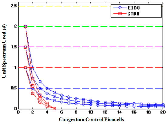 Figure 10 shows the variation in the congestion level for the given line spectrum and a total of twenty picocells. At 5 picocells, the congestion control of EIDO dropped completely, while EIDO never drops to zero at 20 picocells.