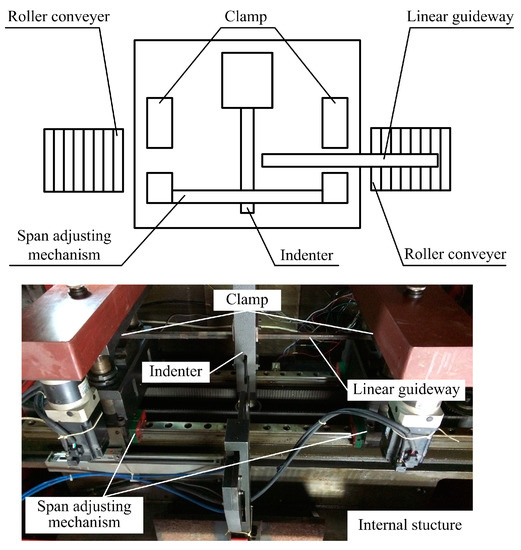 The straightening machine for the linear guideways used for precise straightening was designed by following the three-point pressure straightening principle. As the deflection curve of the linear guideway is assumed as a single-arc shape, the straightening precision was determined by supporting distance, straightening stoke, and the measurement accuracy of deflection. The layout of the straightening machine with respect to the linear guideways is shown in Figure 1. The straightening machine consists of a horizontal frame in which the indenter for loading and two clamps for supporting are horizontally fixed on opposite sides. The roller conveyers were symmetrically placed on both sides of the worktable to finish the conveying process of the workpiece. The distance between two clamps can be adjusted by the span adjusting mechanism to adapt the length of the workpiece. The stroke of indenter generated by slider-crank mechanism is then calculated to realize the reciprocating motion for loading and unloading. The straightening indenter library is also established to meet demands of straightening process for linear guideways with different cross-section parameters.