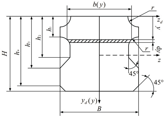The cross-section parameters with respect to the linear guideways for grinding, milling and drilling machine (LG series) are shown in Figure 2, in which H is the height of the cross section and B is the width. The positions of the neutral axis and neutral surface generate deviation compared with the ideal rectangular section because of the asymmetrical geometry model. This deviation changes not only the geometrical characteristic of the cross-section, but also stresses distribution and external moment. The straightening process for the linear guideway with the entire part features is also based on the basic assumptions for bending processes, so it still has the longitudinal symmetry plane.