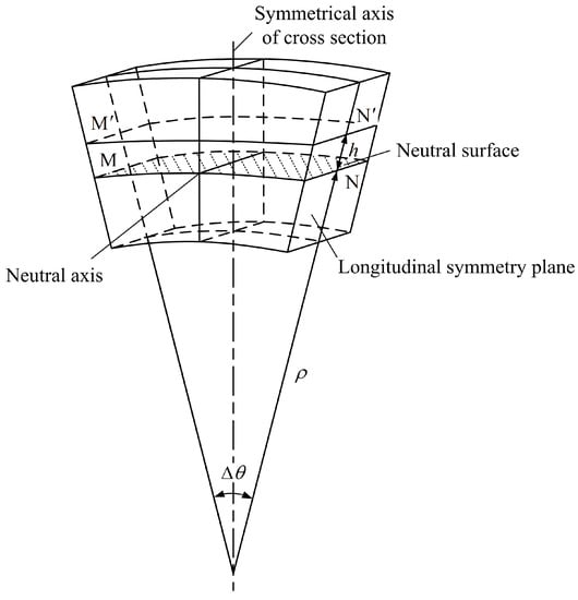 The straightening process of linear guideways with asymmetrical geometry model can be also regarded as plane bending despite the offset of the neutral axis and neutral surface, so the basic assumptions including plane assumption and longitudinal fiber assumption still apply in this situation. The bending deformation of the workpiece is shown in Figure 3. The micro unit MN is chosen to analyze the bending characteristic of the linear guideway, the length of which is constant on the neutral surface. Assuming the curvature radius of neutral surface is , the angle of curvature of the micro unit is . The deformation of a fiber layer whose height is from neutral surface can be expressed as: