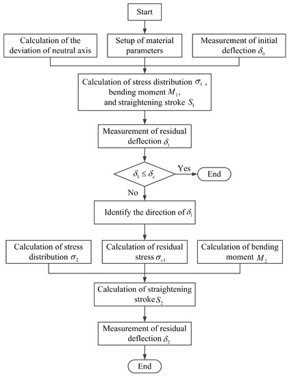 In the programme of the analytical model, the positions of the neutral axis are calculated based on the sectional dimensions of the workpiece. During the simulation, the parameters have been initialized by the actual work condition, which have the influence on the straightening accuracy, such as the parameters of material properties , , and , machine kinematics . The straightening process actually begins with the measurement of initial deflection with respect to the workpiece, so the distribution of loading stress and the bending moment can be calculated by Equations (11) and (12). The straightening stroke of the first step is finally predicted based on initial deflection , parameters of material properties, and bending moment . The residual deflection is measured when the first step of straightening process is finished. If the residual deflection meets , it means that the workpiece has satisfied the requirement of accuracy.