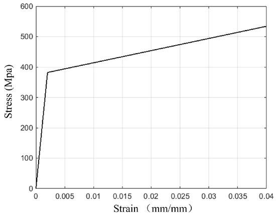 According to Equation (2), the deviation of the neutral axis can be obtained, and the neutral axis exactly divides the cross-section into two equal areas. When the external bending moment is applied on the guideway in the straightening process, the actual process of deformation contains the elastic stage and plastic stage, which is regarded as a complicated nonlinear problem. To simplify the calculation process, the linear hardening material model has been adopted to describe true stress-strain curve in the bending process [23]. As the linear hardening material obtains obvious elastic limit and short yield procedure, the yield limit is used in the calculation process. The stress-strain curve can be given as: