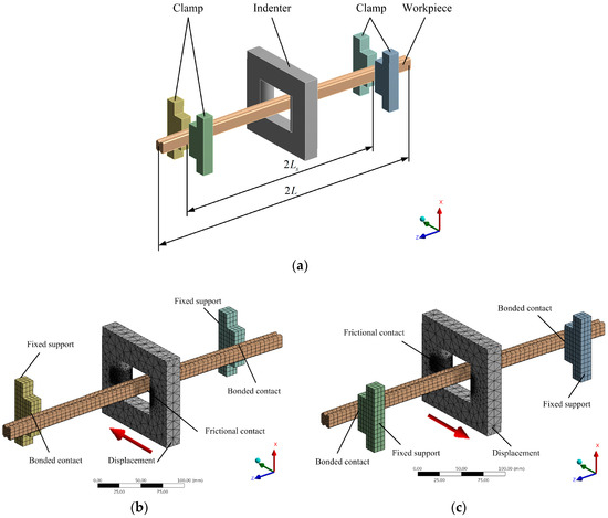 FE model of the multi-step straightening process with respect to linear guideways: (a) the 3D numerical model of the straightening process; (b) meshing and boundary conditions in the compressive direction of straightening process; (c) meshing and boundary conditions in the tensile direction of straightening process.