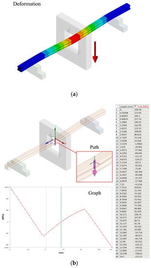 The straightening indenter is considered as a rigid body, which is meshed with rigid quadrilateral elements (SOLID187) by swept method. As the workpiece generates elasto-plastic deformation in the straightening process, the element type of workpiece is important to simulation accuracy. The hexahedral elements (SOLID186) are applied for the workpiece according to the actual deformation extent. To guarantee the simulation accuracy of the straightening process, the restricted function for meshing size in contact regions is adopted. Owing to the balance between simulation accuracy and solution speed, the maximum value in the contact region of the indenter and workpiece is set up as 1 mm. In terms of the analysis of simulation results, the deflection of the linear guideway during the simulation process is detected by the deformation applied on the linear guideway as shown in Figure 10a, while a path is generated along the longitudinal direction to describe the longitudinal stress. Based on the defined path, the graph and tabular data with respect to longitudinal stress can be obtained (Figure 10b).