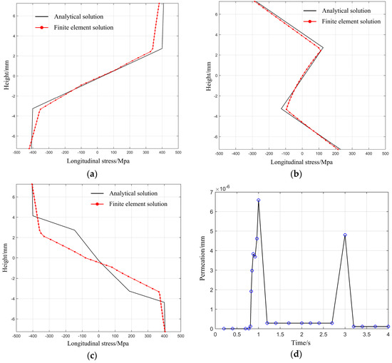 Owing to the existence of residual stress, the longitudinal stress distribution with respect to the second straightening step would be changed. It is considered as a linear superposition of residual stress and theoretical loading stress based on the basic assumptions. As shown in the Figure 11c, there are some differences with respect to the stress curve between theoretical results and simulation results. However, the height of elastic region, the yield stresses in tension and compression based on theoretical results are basically consistent with that by simulation results.