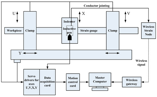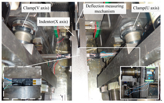 The experiments of the multi-step straightening process were performed by the ROSE-JZ50 straightening machine (Accuracy: 0.15 mm/m). The indenter driven by servo motors and crank-link mechanism was horizontally installed to the reference surface consisting of clamps, while the measurement system was fixed on the straightening direction as shown in Figure 13. The closed-loop control of four axes was realized by servo system, sensors, and motion control card by the bus control pattern. In order to achieve the online measurement of deflection, the measurement system consisting of inductive pen and data acquisition card was established, whose performance parameters are shown in Table 2.