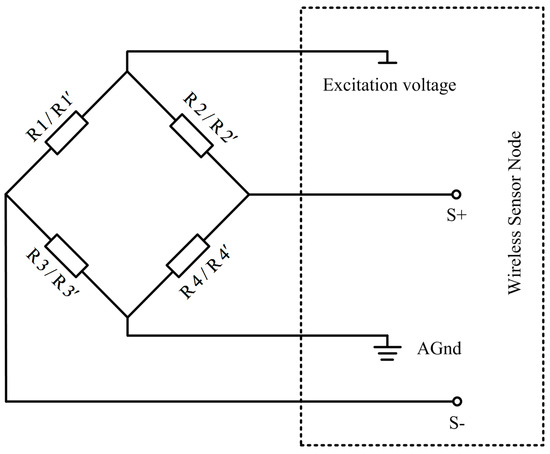 To detect stress variation in the straightening process, the released strains are measured by WSN (Wireless Sensor Network) as shown in Figure 13, and the residual stresses are then calculated based on elasto-plastic theory. The WSN system is a multi-hop network formed by wireless communication. It consists of sensor nodes and wireless gateway to finish data collection and data transmission. The full-bridge circuit was adopted in the WSN system, and its connection with internal circuit of sensor nodes is shown in Figure 14. The output voltage can be expressed as [25]: