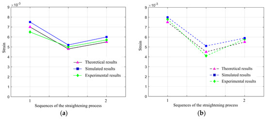 In Table 3, the stress and strain on the tensile and compressive surfaces based on theoretical results, simulation results, and experimental results are shown for the two-step straightening process of the sample workpiece. However, the stresses on the tensile and compressive surfaces cannot be directly detected by the straightening experiments. In Figure 16, the experimental results of strain variation on tensile and compressive surfaces with respect to the sample workpiece are displayed, together with the theoretical results and simulation results, using the same sample workpiece. The simulation and experimental results also show the asymmetry of stresses in tensile and compressive regions was caused by the deviation of neutral axis. This is in accordance with expectations. The max errors between theoretical results and simulation results are 6.37% and 0.74%, while the max errors between theoretical results and experimental results are 7.14% and 9.09%, in different sequences of the straightening process, respectively. Although there is a slight difference in the simulation results of bending strain and stress, they still confirm the applicability and accuracy of the proposed analytical model.