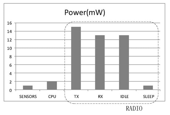 Figure 1 shows the energy consumption of a sensor in the whole process. We can see the transport and receiving modules consume the most of the energy, the idle listening module also belongs to the communication part, and the energy consumption of communication follows the formula , the parameter  is influenced by the communication distance, i.e., when the communication distance is long, the parameter  will be also larger, and, meanwhile, the communicating consumption of the sensor node will increase [,].