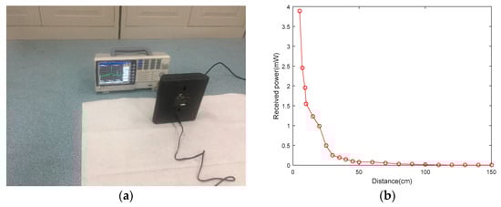 The TX91501 (Powercast, 620 Alpha Drive, Pittsburgh, PA, 15238, USA) is a typical charging equipment produced by Powercaster. In order to study the WPT efficiency of TX91501 [], we have performed an experiment to contrast the efficiency of different distance. With the change of the distance between the TX91501 and the spectrum analyzer (GSP-730 manufactured by GWINSTEK), we have calculated the valid and farthest distance. Figure 2b shows the efficiency change of different distances: in reality, the efficiency is higher when the distance is lower, and the farthest distance is 50 cm.
