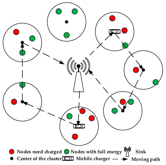 With the increasing quantity of sensor nodes, one MC still cannot satisfy all the sensor nodes in a charging cycle [], so another problem about the least number of MCs is worth exploring. Dai and Kar have proposed an algorithm to minimize the number of MCs [,]. How to improve the charging efficiency is the key and, at the same time, clustering the sensor nodes in the region is of great importance with the increasing number of sensor nodes. Lin has studied nonoverlapping clusters, meaning the clusters in the region are separated from each other [].