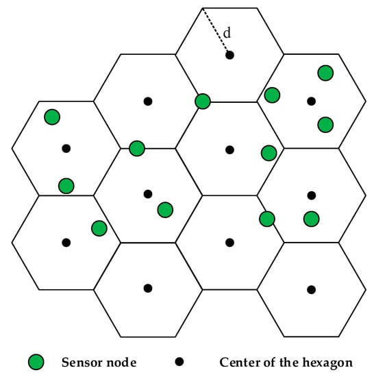 The Table 2 reflects the different consequences of the labelling of the sensor nodes. For sensor node , , so x1 of the  is assigned a value of 1, and other labelling parameters are 0. For , sensor node is labelled twice, one labelling is when , so the x1 of  is bounded of the value of 4, another is when , we label the x3 of  as 3 and, obviously,  is closer to the center point of the hexagon which  is in the range of the incircle of cluster . We just assign the x3 of  with the value of 0, and the sensor node  can be confirmed to belong to cluster . For , the x1 and x2 are labelled with values of 5 and 6 at the same time, that is, the  is on the edge of cluster  and cluster . Then we consider the distance between the cluster and the sink, we choose the closest one to be the appropriate cluster. If the distance is equal, we randomly select from cluster  and cluster .  is at the intersection point of the cluster , , and , and we similarly consider the distance to the sink, and choose the optimal cluster, like .