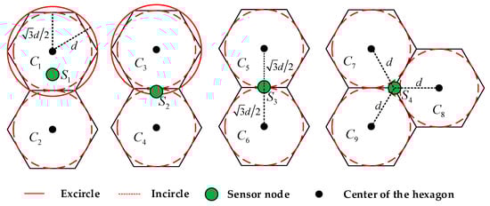 We can know that there are four possible positions of the sensor nodes in the WRSN. To distinguish the sensor nodes precisely and fast, we have considered a method of labelling which is shown in Figure 5. We defined x1 to be the condition that the sensor node is in the incircle of the hexagon, in other words, the distance between the sensor node and the center of one hexagon meet the condition: . When the sensor node is within the range of the incircle of the cluster  and the excircle of cluster  from Figure 5, the distance between sensor node and cluster  follows: , we use x3 to label the sensor node when the sensor node is in a annulus; similarly, when , there are two hexagons meeting the condition, we use x1 and x2 to label the sensor node of possible clusters; and, lastly, when  in Figure 5c, there are three possible clusters and we label the sensor node with x1, x2, and x3 separately, the number of labelling is the serial number of each cluster.