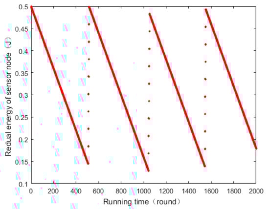 Once an existing a sensor node needs to be charged, it reports to the sink with a charging request. The whole WRSN can run for a long time without any sensor nodes dying. Due to each sensor node needing to be recharged, the energy of the sensor is changed periodically. In Figure 7, the horizontal axis is the running time, and the ordinate is the residual energy of the sensor node. We can see the energy of the sensor node is always higher than 0.1, and the energy induces a periodic sawtooth-like behavior. When the energy of the sensor node is lower than the charging threshold , the MC comes to charge the sensor node. As a result, the energy increases gradually. Since the MC cannot always come to the sensor node in time, the lowest energy in each charging cycle is different. At the same time, due to the sensor node always consuming its energy, the maximum energy is also different after each charging cycle.