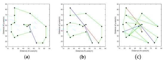 The comparison of the path diagram by three algorithms. (a) The path diagram of REGP; (b) the path diagram of NJNP; and (c) the path diagram of EDF.