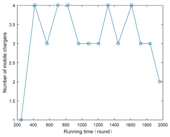 Only one MC cannot serve all sensor nodes in one charging cycle, so several MCs are arranged to ensure no sensor nodes die in the whole process. Since no sensor nodes can die in the WRSN, even if only one sensor node needs to be recharged, the sink should also dispatch a MC to visit the cluster. At the same time, there would be number of sensor nodes that need to be served, so the number of the MCs may also be large. In Figure 9, the maximum number of MCs is 4, and the minimum is 1, and the number of MCs is always changing irregularly. The number of MCs is calculated in advance by the DMC algorithm. When the first charging cycle begins, the DMC algorithm has calculated the number of MCs as 1, and then one MC starts from the sink and serves all clusters needed. The MC returns to the sink after charging, then the next charging cycle begins and the number of MCs increases to 4. The process is always carried out periodically.