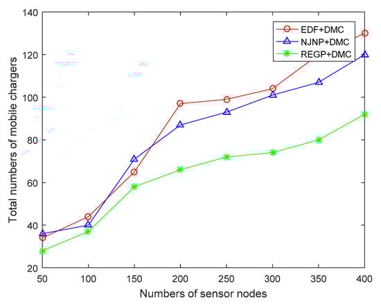 In this paper, we consider the beginning of the charging as the time when one sensor node meets the charging threshold. That means if only one sensor node needs to be recharged at one time, the sink also arranges a MC to serve the cluster. Thus, the lifecycle of the whole WSRN is largely increased, and the total quantity of MCs in the whole process reflects the charging efficiency of the MCs. The lower number of MCs means a longer charging cycle and a longer serving time of each MC. From Figure 10, the time of the whole process is set as 2000 rounds, with the number of sensor nodes increases, the total quantity of MCs also increases. We can see the EDF and NJNP are always higher than the REGP algorithm, and the REGP algorithm has fewer MCs in each process. With the charging queue not optimized, NJNP may always need more MCs in each charging cycle.