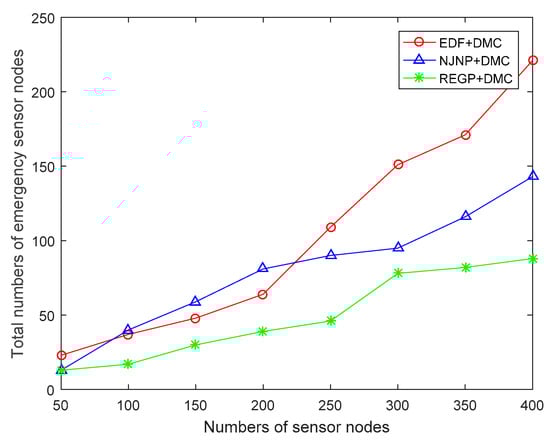 Emergency sensor nodes are the sensor nodes which meet one third of the charging threshold, and fewer emergency sensor nodes represent the higher stability of the WSRN. This is owing to the DMC algorithm: with more MCs, more sensor nodes can be recharged in time. From Figure 11, the time of the whole process is also set as 2000 rounds, and the REGP is always lower than EDF and NJNP. With fewer emergency sensor nodes in the whole process, the REGP algorithm performs better than EDF and NJNP, in that the EDF does not consider the position of each sensor, and it could bring about more time of moving of the MC. At the same time, NJNP does not consider the residual energy of each sensor node, causing more emergency sensor nodes not be recharged in time.