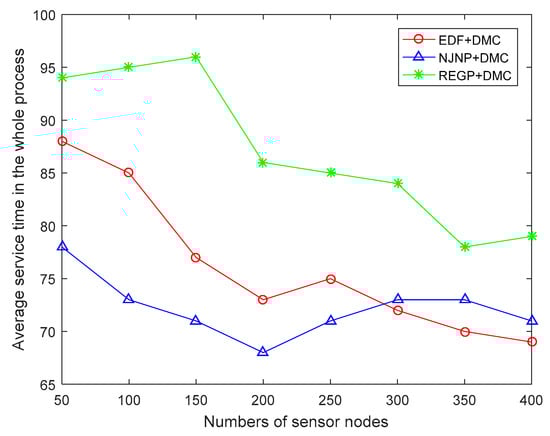 In this paper, we consider the serving time with respect to the whole time for a MC to start from the sink and return to the sink. As shown in the Figure 12, with the number of sensor nodes increasing, the average serving time of the whole process decreases, and the decrease is attributed to the increasing number of emergency sensor nodes. To ensure no sensor nodes died, more MCs need to be dispatched to deal with the emergency sensor nodes. From Figure 12, we can also see that the REGP algorithm is always higher than EDF and NJNP. This means that, in the REGP algorithm, the number of emergency sensor nodes is smaller than EDF and NJNP, and higher serving time also represents a higher efficiency of MCs.