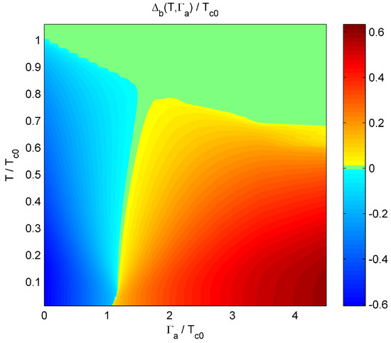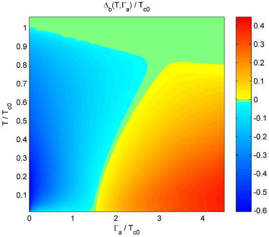 Dependence of the lowest-frequency Matsubara gap function , indicated by the color code, for the band b on the scattering rate and the temperature T in the Born limit, . All quantities are normalized by . Green color marks the state with the vanishingly small gap, .