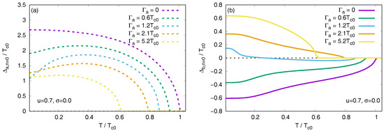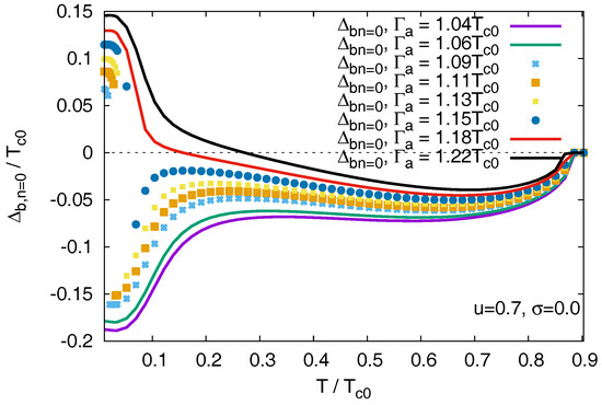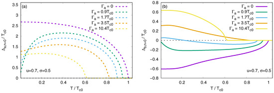 Previously, we found a steep change in the smaller gap as a function of the scattering rate in the weak scattering limit [42]. Here we observe that the same jump is present in the temperature dependence of the gap. See Figure 8, where in the Born limit is shown. A discontinuous jump in the temperature dependence of the smaller gap appears at .