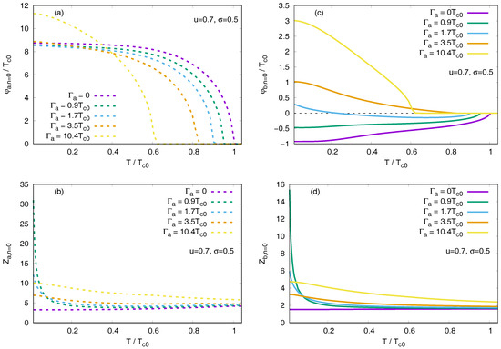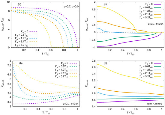 To illustrate the mentioned points, in Figure 3 and Figure 4 we present results for the temperature dependence of the gap function , order parameter , and the renormalization factor for several fixed values of for . Temperature dependencies for are shown in Figure 5 and Figure 6. The gap in band a has the same positive sign for all values of and vanishes at (see Figure 3a and Figure 5a). However, there is a small range of values around for which the gap is an increasing function of T at low temperatures. At the same time, the order parameter behaves quite conventionally and decreases towards (see Figure 4a and Figure 6a). The unusual temperature dependence of the gap at the lowest Matsubara frequency is due to the renormalization factor that is shown in Figure 4b and Figure 6b. That is, according to Equation (9), large values of taking place at low temperatures lead to the decrease of . For the band b, the same effect is not seen in the Born limit, but becomes pronounced in the intermediate scattering limit. Compare the gap function in Figure 5b and the order parameter in Figure 6c, and also notice the low-temperature behavior of in Figure 6d. In principle, similar gap behavior may occur from the functional form of gaps at real frequencies (see Equation (7) in Ref. [50]).
