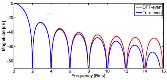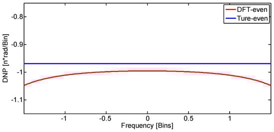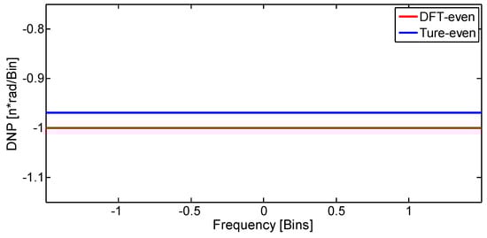 In the two cases, the results of DFT were all real, because of the symmetry and real in the time domain. As a result, after the windows were shifted, both of them had a linear phase, with the difference being that the slope for the DFT-even window was (see Appendix A) and the slope for the true-even window was (see Appendix B). This is because the number of shifting points was N/2 for the DFT-even window and was (N − 1)/2 for the true-even window. Figure 2, Figure 3 and Figure 4 show the normalized log-magnitude response (NLMR), the normalized phase response (NPR), and the derivative of normalized phase response (DNPR). The results coincided well with the theoretical analysis.