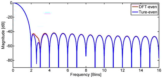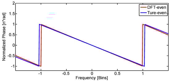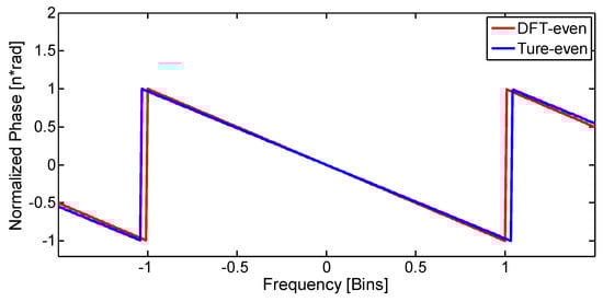 The phase response in the main lobe, and especially the phase response near the main lobe center is of more significance, as it has a decisive influence on the phase distortion of the tapered signal [,,]. The problem is more notable for the FFT of a discrete time signal, due to the picket fence effect [,]. The phase distortion is determined by the frequency deviation and the variation of phase response near the main lobe center of the adopted window []. As a result, expanding around the center in the main lobe with , one can reach