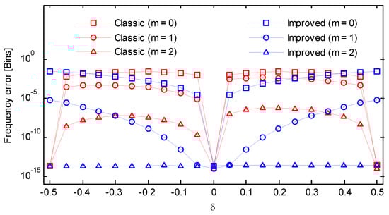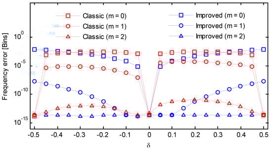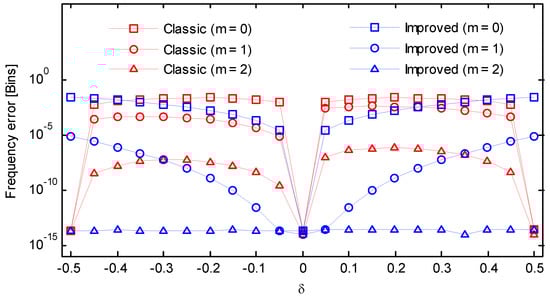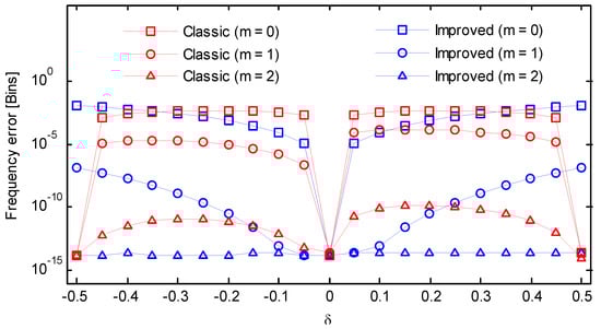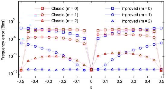 In Equation (22), the amplitude was set to 1. Both the sampling rate and the number of analyzed samples N was set to 256, resulting in a frequency resolution of . First, we considered the cases free of noise. The frequency scanned from 63.5 to 64.5 in steps of 0.05. For each frequency, the phase scanned from to in steps of , and the maximum absolute estimation error between the estimate and the theoretical value was selected as the result. All frequency estimates were scaled by frequency resolution and expressed in frequency bin. The adopted asymmetric windows were [t]2-windows defined in [], which was constructed by the truncation method. The remaining errors for the Kaiser–Bessel window, Gaussian window, Hanning window, Hamming window, and Blackman window were reported in Figure 9, Figure 10, Figure 11, Figure 12 and Figure 13 as a function of frequency deviation. As can be seen from these figures, the asymmetric windows-based phase difference method had good compatibility with different window functions. The maximum absolute estimation errors for the classic method with m = 0 were about 10−3~10−2. By performing an iteration, the level decreased to 10−5~10−4. Without iteration, the improved method had a similar performance to the classic method but attained a worst case at . However, after an iteration, the errors sharply decreased and were all below 10−5. The remaining errors could be completely removed after two iterative operations even for the case where . As a result, in the absence of noise, an iteration in the proposed algorithm was enough to achieve a high accurate result.