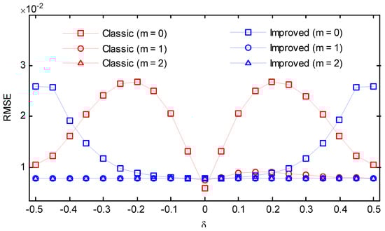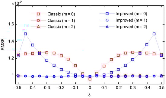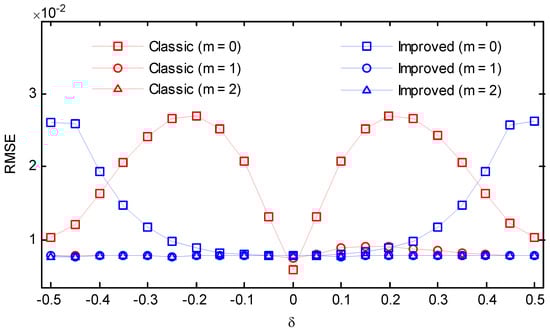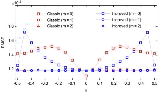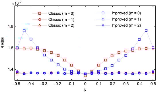 RMSEs of the classic and the improved secant method (SNR = 10 dB, Kaiser–Bessel window, ).